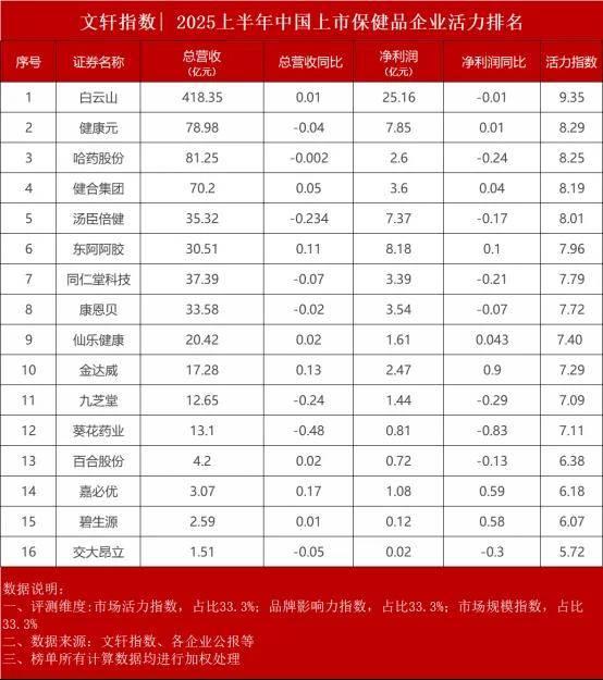 2025年上半年,中國(guó)保健食品行業(yè)在消費(fèi)需求迭代與市場(chǎng)競(jìng)爭(zhēng)加劇的雙重驅(qū)動(dòng)下,呈現(xiàn)出頭部穩(wěn)守、腰部分化、尾部承壓的格局。文軒指數(shù)”發(fā)布的《2025上半年中國(guó)上市保健品企業(yè)活力排名》,為洞察行業(yè)現(xiàn)狀提供了重要參考。其中,東阿阿膠以雙位數(shù)增長(zhǎng)實(shí)現(xiàn)經(jīng)典“翻紅”,金達(dá)威憑近九成凈利增幅上演“躺賺”戲碼,成為榜單中最亮眼的兩大主角。在行業(yè)分化的背景下,誰(shuí)能承接增長(zhǎng)紅利,成為下一個(gè)引領(lǐng)風(fēng)口的黑馬?