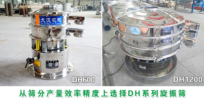 DH系列旋振篩型號(hào)齊全產(chǎn)量大,型號(hào)分為直徑400mm型、600mm型、800mm型、1000mm型、1200mm型、1500mm型、1800mm型、2000mm型等八種標(biāo)準(zhǔn)機(jī)型。篩分分級(jí)橡膠粉處理量可達(dá)400kg-2T/h,可將物料沿著篩網(wǎng)篩面充分篩分,過網(wǎng)率高篩分精度可達(dá)95%。