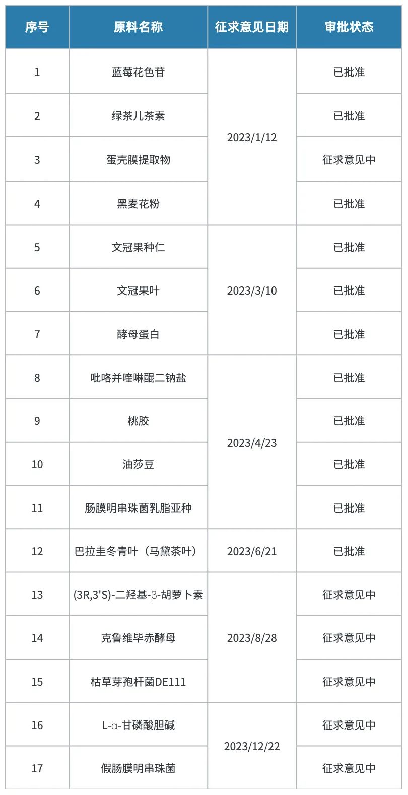 征求意見17種,分別是藍(lán)莓花色苷、綠茶兒茶素、蛋殼膜提取物、黑麥花粉、文冠果種仁、文冠果葉、酵母蛋白、桃膠、油莎豆、腸膜明串珠菌乳脂亞種、吡咯并喹啉醌二鈉鹽、巴拉圭冬青葉(馬黛茶葉)、(3R,3'S)-二羥基-β-胡蘿卜素、克魯維畢赤酵母、枯草芽孢桿菌DE111、L-α-甘磷酸膽堿、假腸膜明串珠菌;